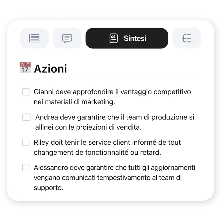Estrai automaticamente gli spunti utilizzabili da riunioni e conversazioni. Risparmia tempo nei follow-up garantendo che tutte le attività siano monitorate.