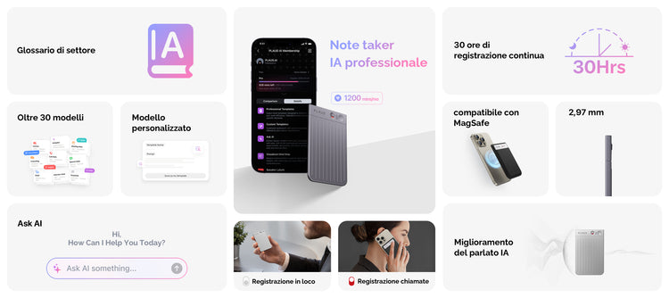 PLAUD NOTE *1, Custodia magnetica *1, Anello magnetico *1, Adattatore Type-C *1, Manuale utente *1
