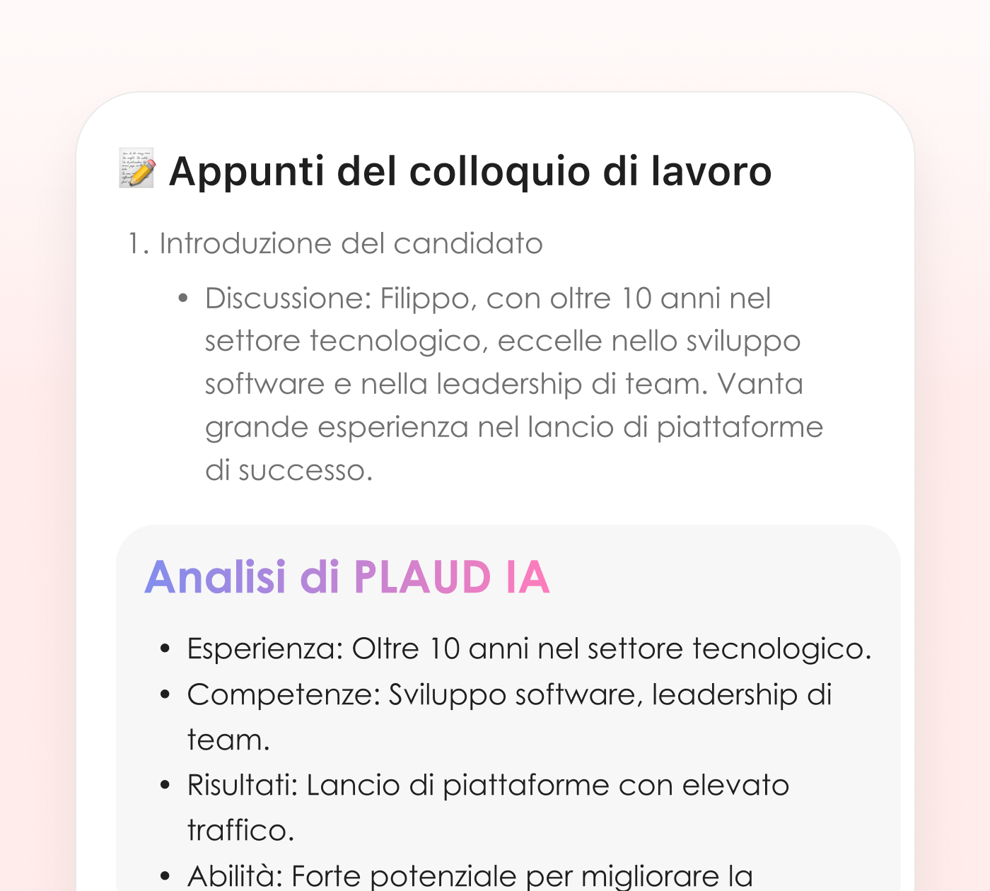 La registrazione audio può essere effettuata solo con il dispositivo NotePin, ma la Trascrizione, il Riassunto e altre funzionalità IA richiedono l'app PLAUD o il sito Web PLAUD (app.plaud.ai).